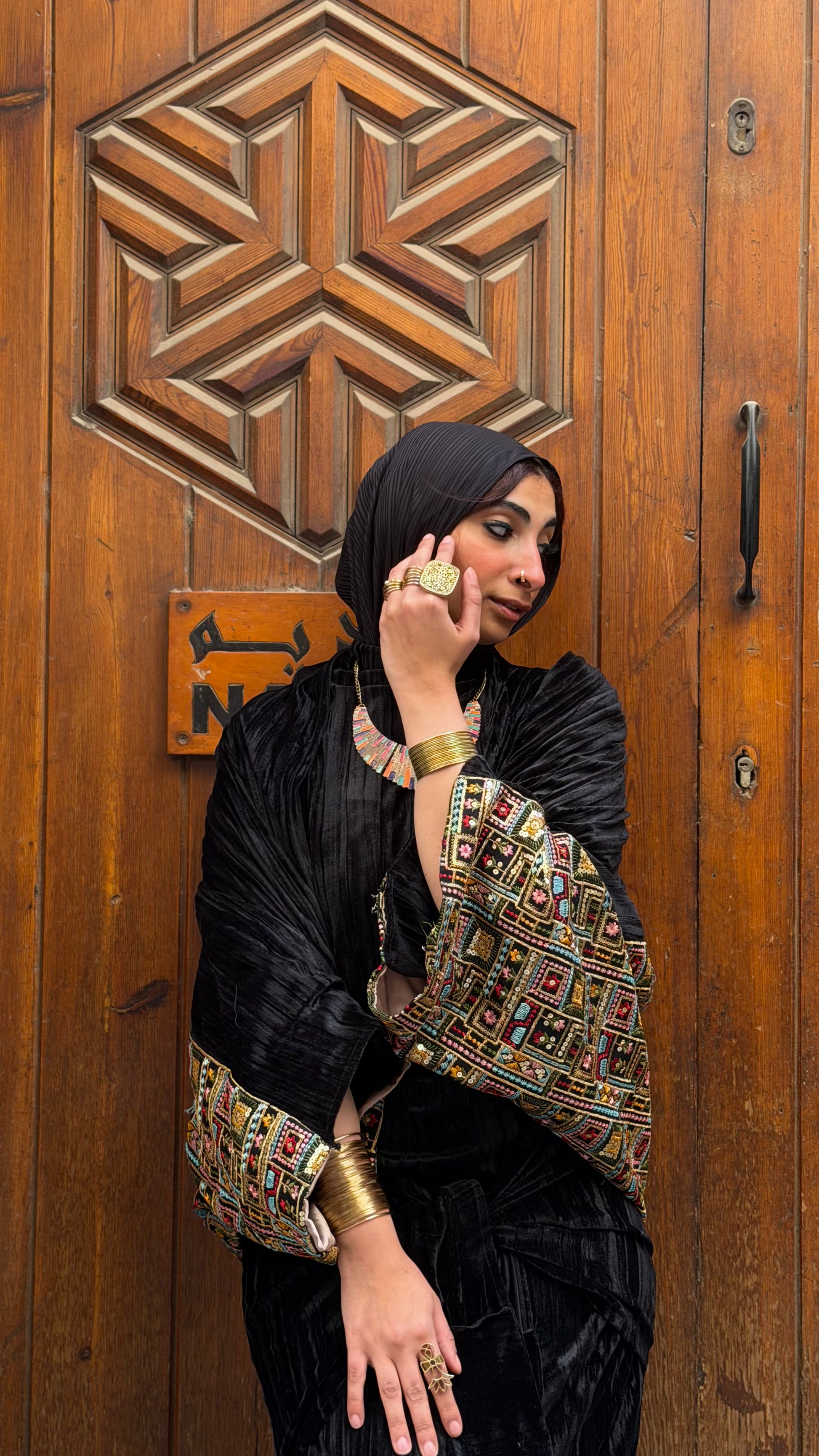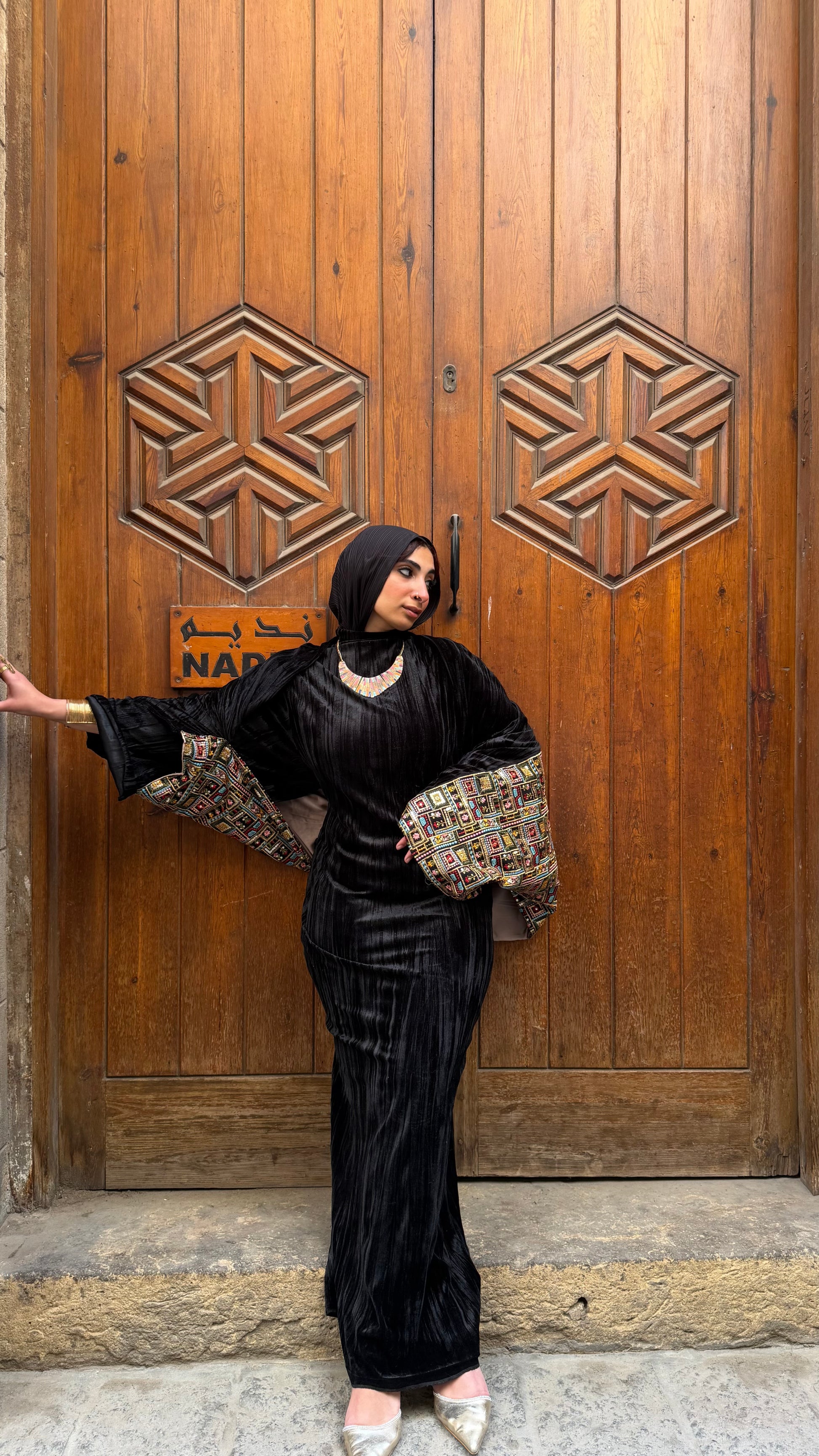 التصميم يعتمد على قصّة انسيابية تعانق القوام بدون مبالغة، مع أكمام واسعة مزخرفة بتطريز هندي ليمنح القطعة حضورًا قويًا وتوازنًا بين الرصانة والفخامة.