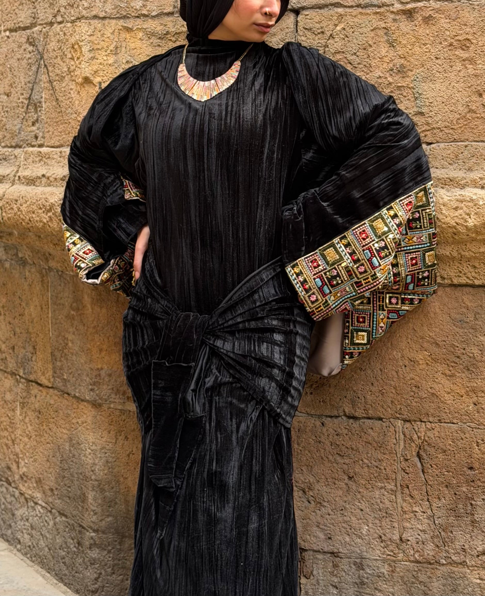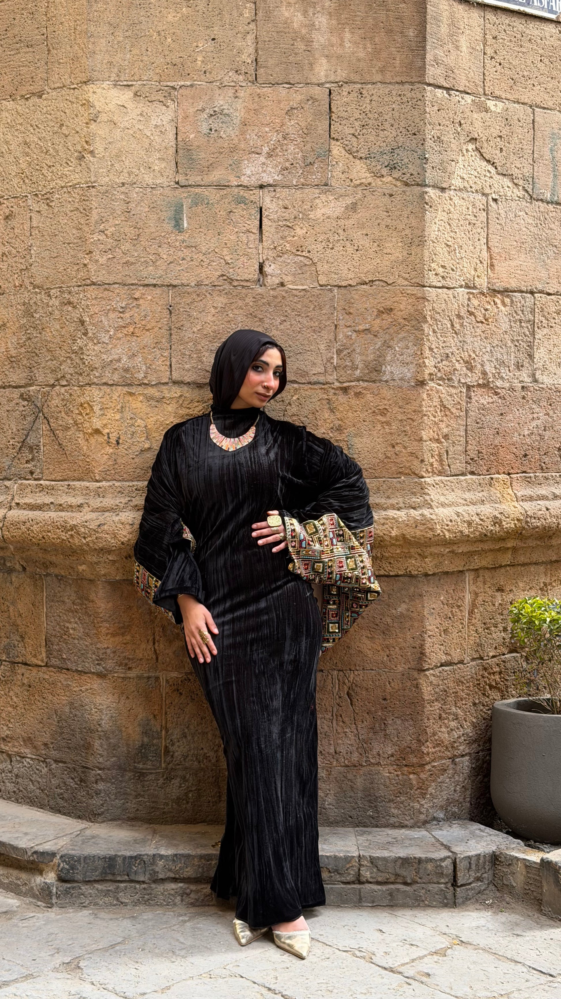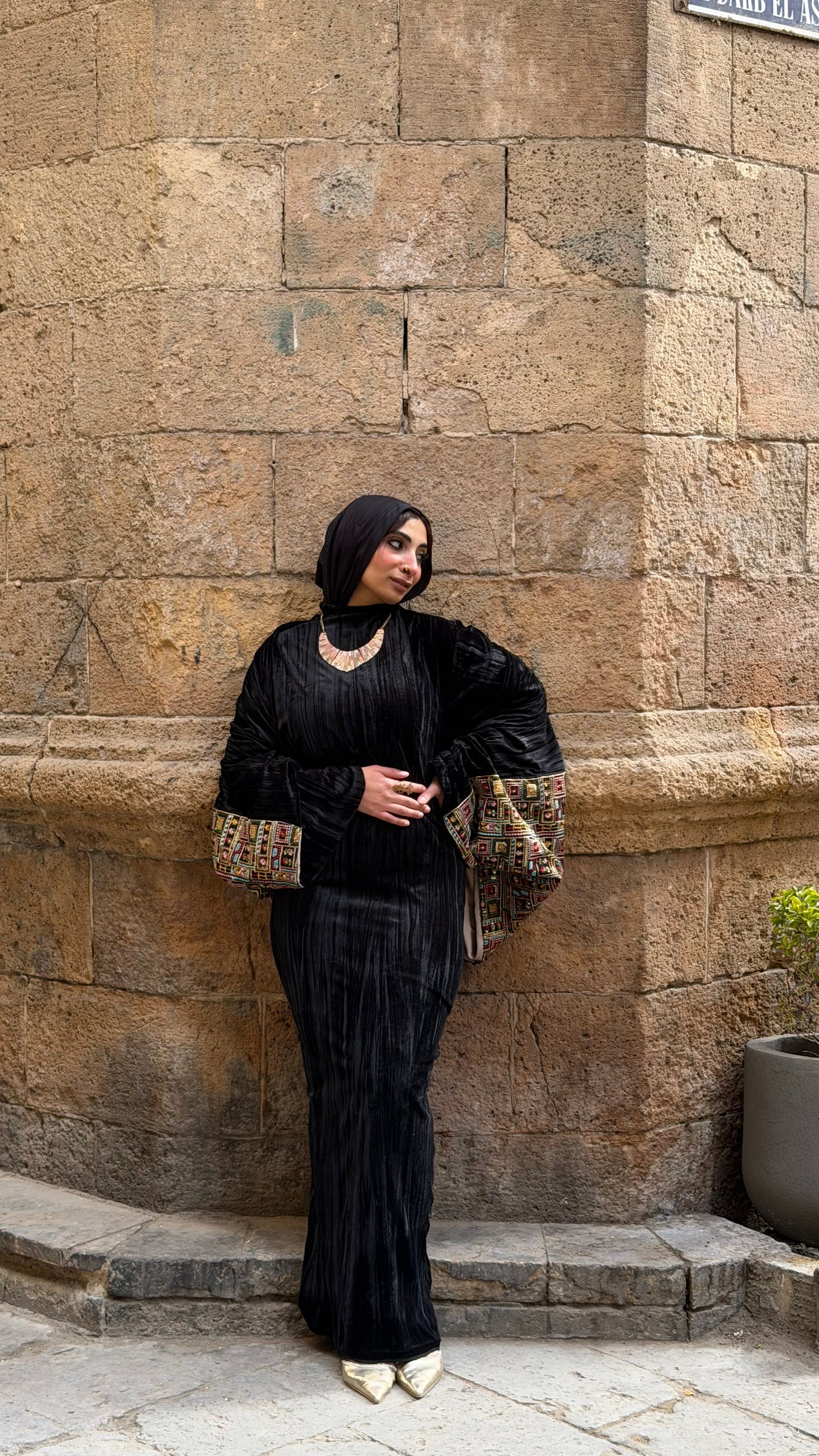 مزيج من قماش مخمل بيليسيه فاخر بملمس ناعم ولمعة خفيفة تظهر مع الإضاءة،ما يعكس عمق اللون الأسود ويمنح القطعة إحساسًا غنيًا وثقيلاً في المظهر،ومريحة في الارتداء ومناسبة للسهرات الرمضانية والمناسبات الراقي و الكتان الخام المطرز تطريز هندي ملكي .
