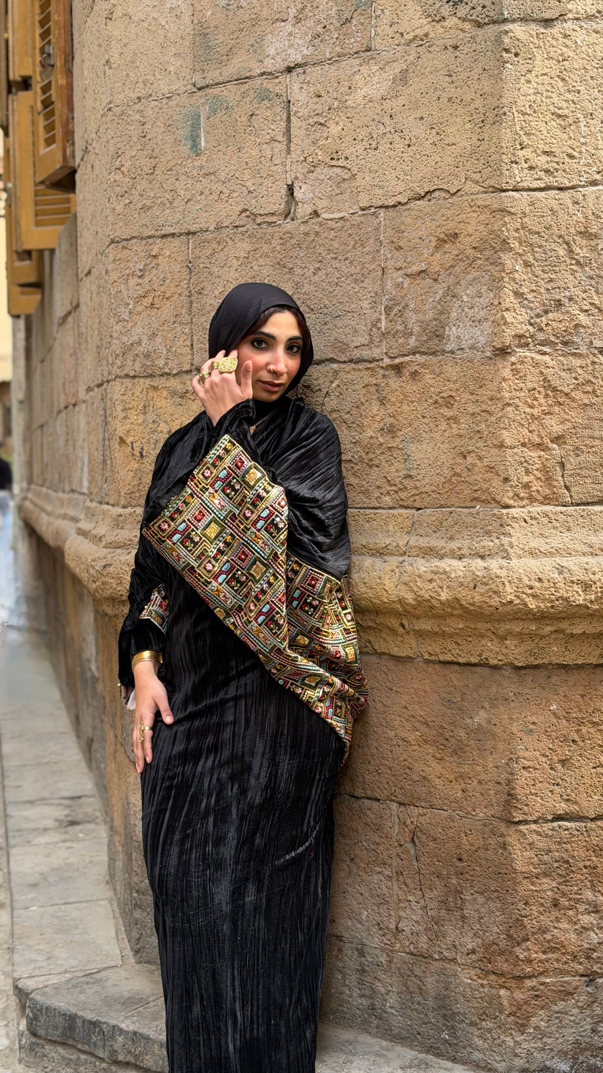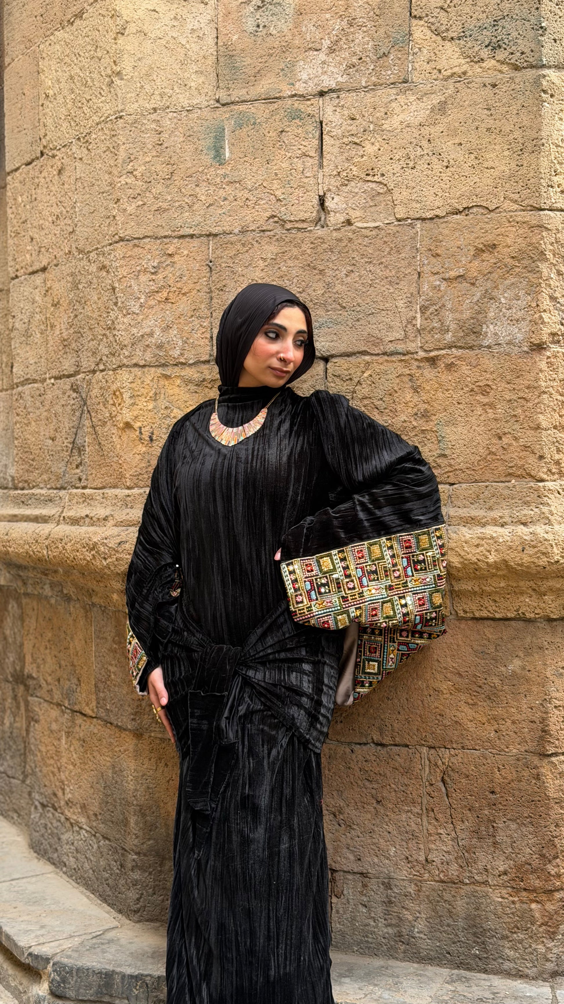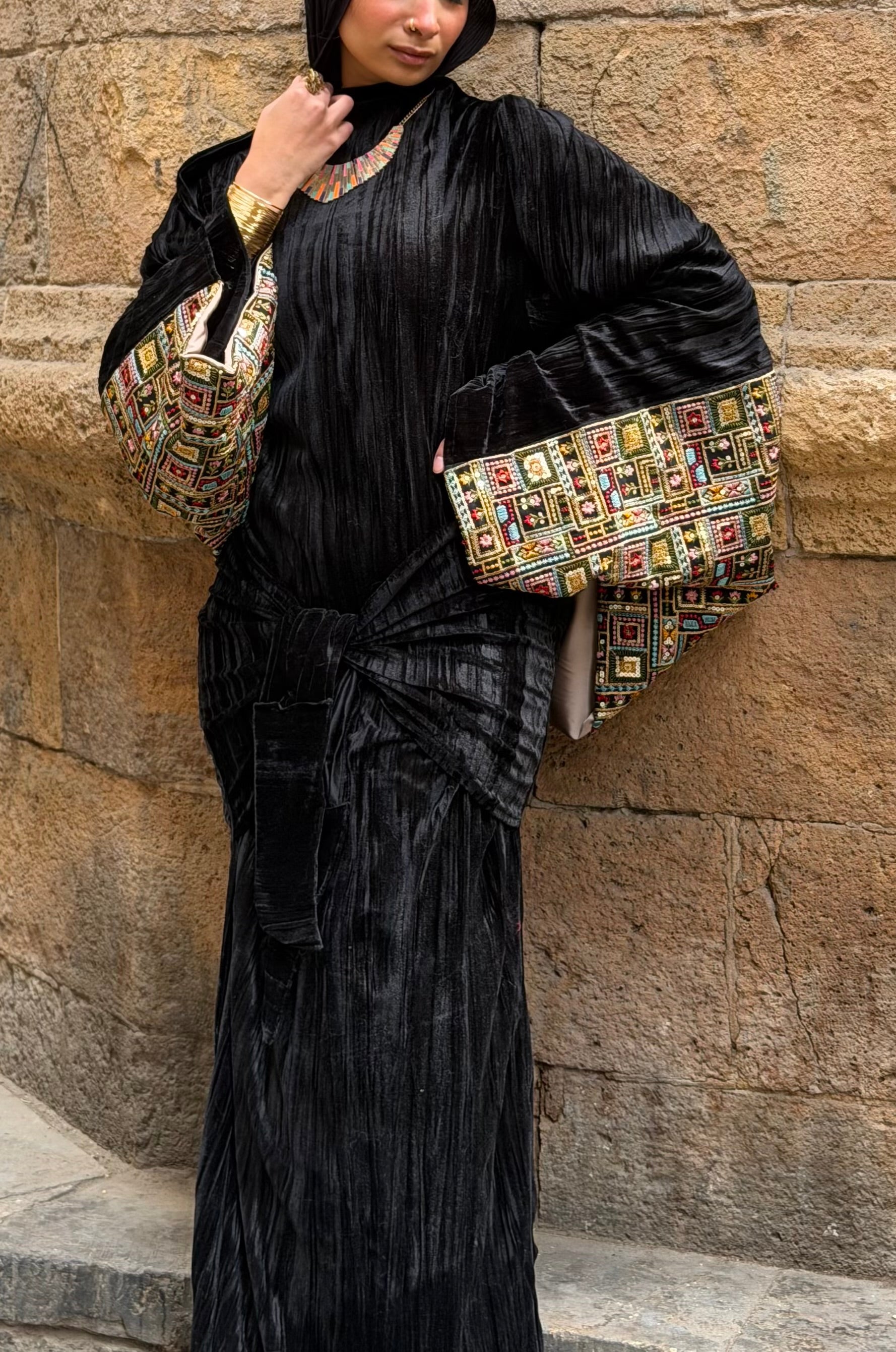 مزيج من قماش مخمل بيليسيه فاخر بملمس ناعم ولمعة خفيفة تظهر مع الإضاءة،ما يعكس عمق اللون الأسود ويمنح القطعة إحساسًا غنيًا وثقيلاً في المظهر،ومريحة في الارتداء ومناسبة للسهرات الرمضانية والمناسبات الراقي و الكتان الخام المطرز تطريز هندي ملكي .