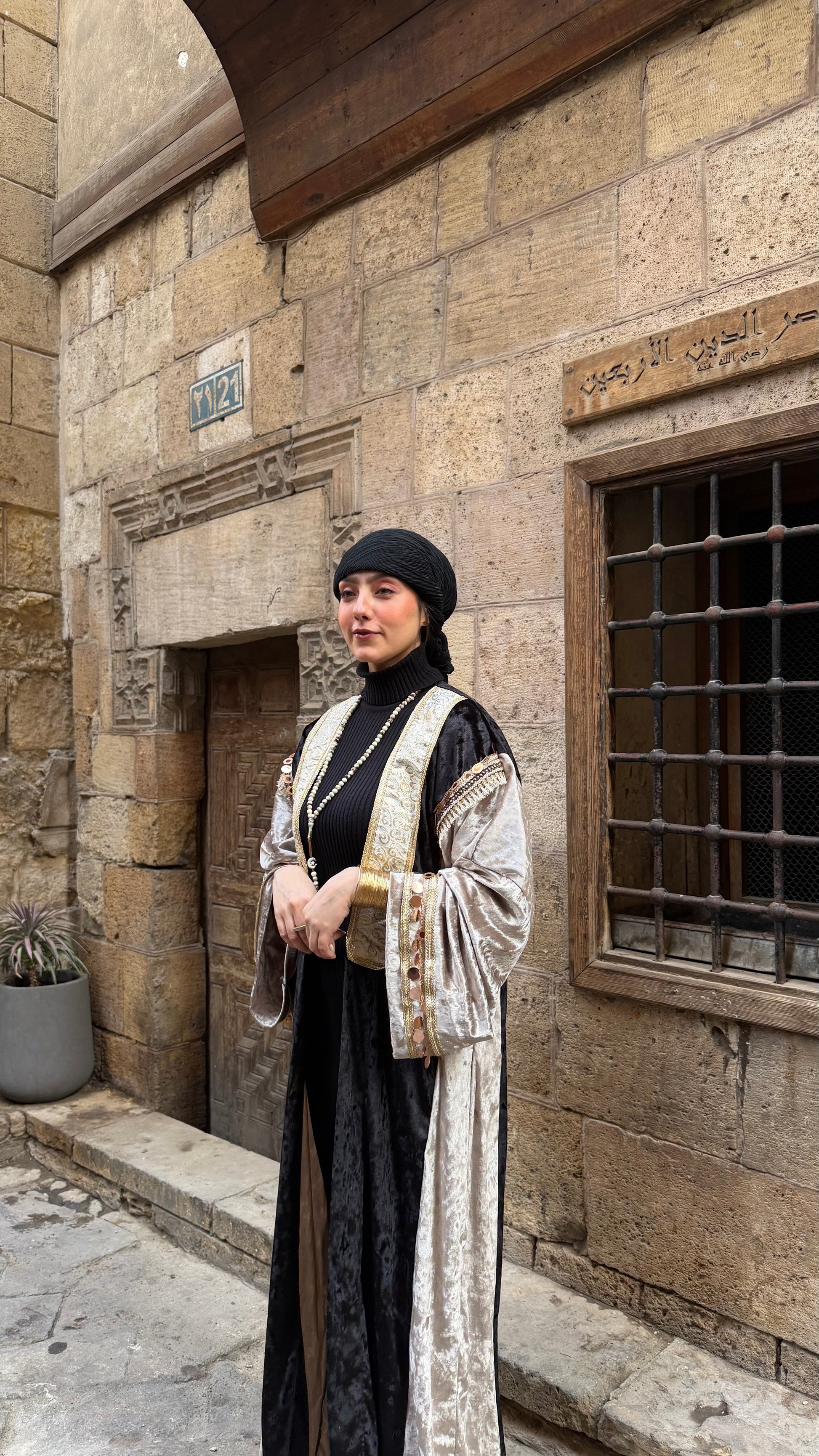 تصميم طويل بانسيابية راقية، يعتمد على تباين مدروس بين المخمل الأسود العميق وقماش فاتح بلمعة مطفية تضيف ثراء بصري من غير صخب.الأطراف والياقة مزينة بتطريز ذهبي كلاسيكي مستوحى من الزخارف الشرقية القديمة، يمنح القطعة حضورًا مهيبًا يليق بالمناسبات الخاصة وليالي رمضان.واسع ومريح، ينسدل على الجسم بنعومة، ليجمع بين الاحتشام والترف في قطعة واحدة.